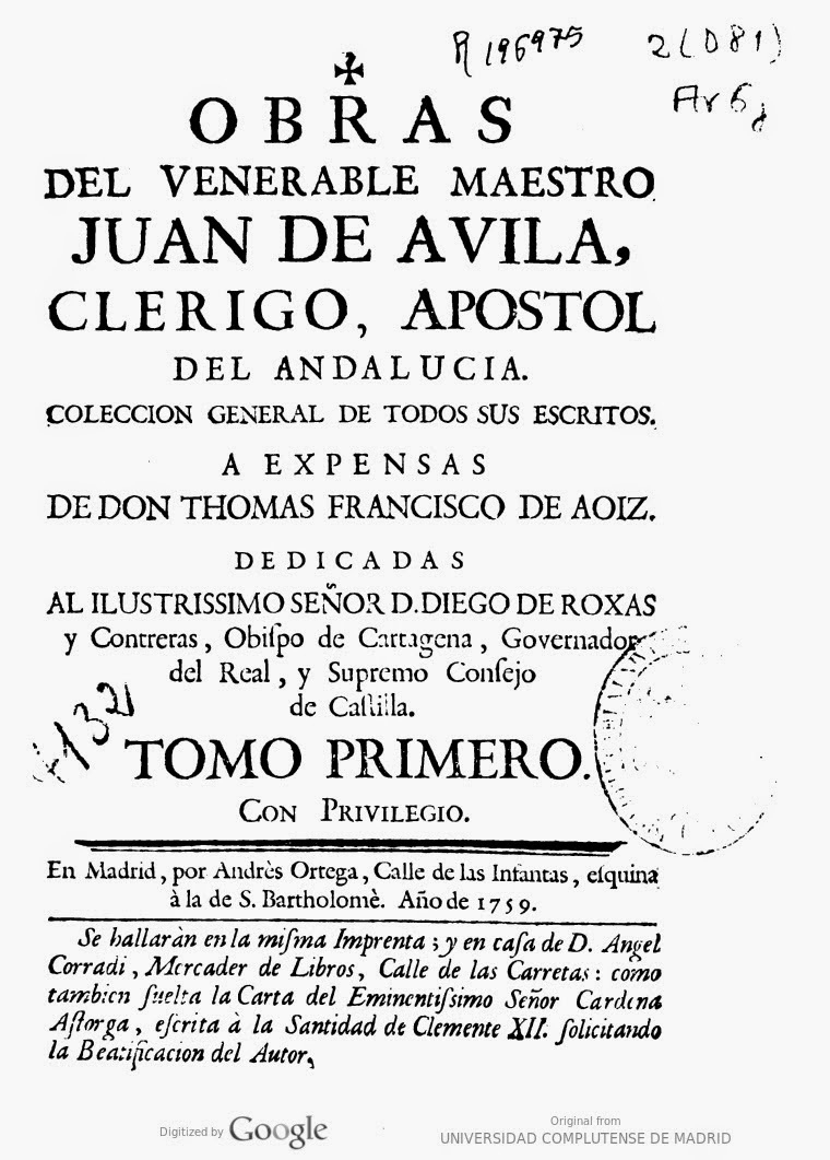 Esto es lo que ha sucedido también con el Maestro Juan de Ávila. Primeramente, su proceso de beatificación —iniciado en 1623 por la Congregación de San Pedo Apóstol de presbíteros naturales de Madrid-—dio lugar, entre otras cosas, a la biografía escrita por el Licenciado Luis Muñoz (Madrid: Imprenta Real, 1635):
